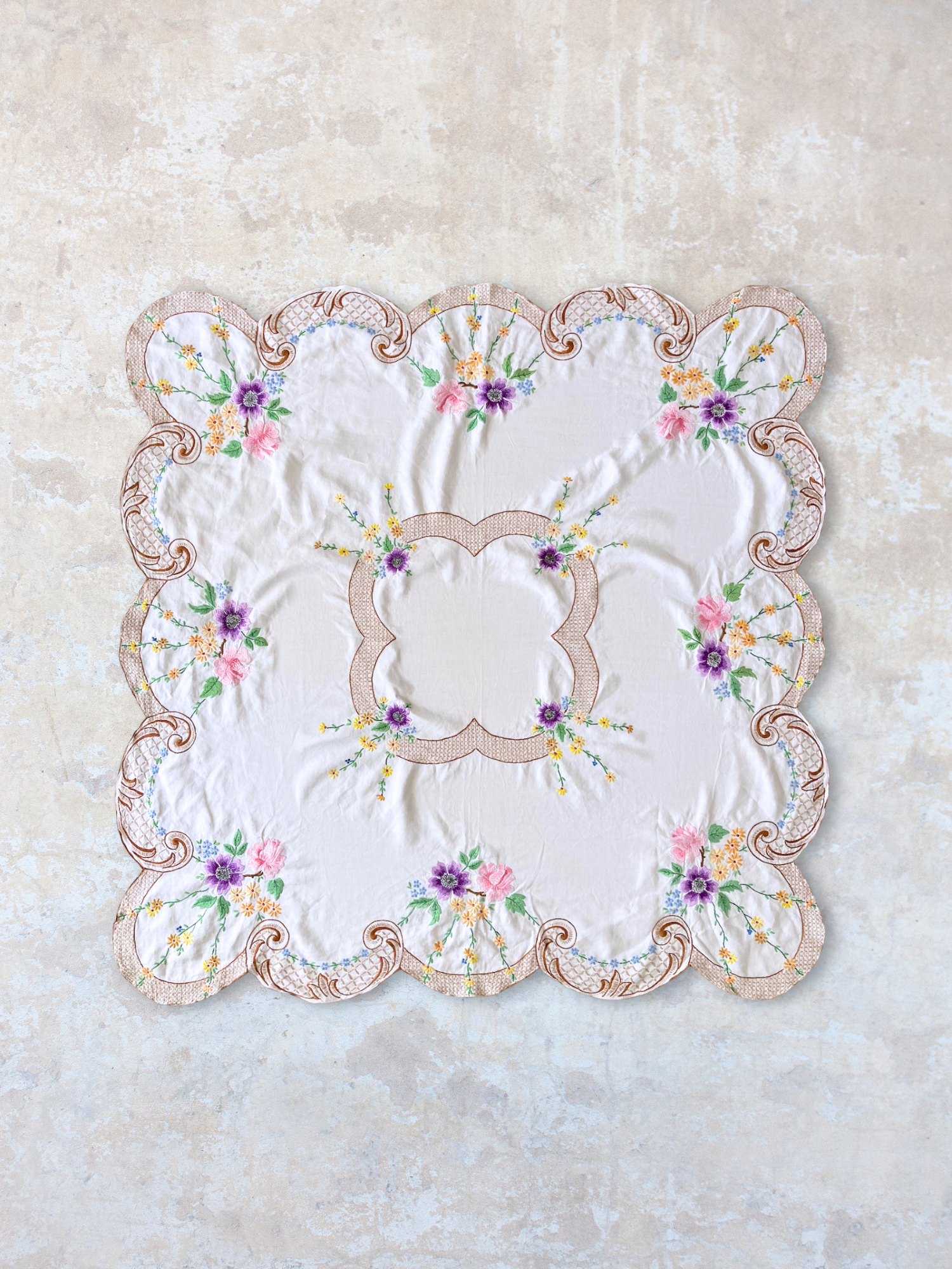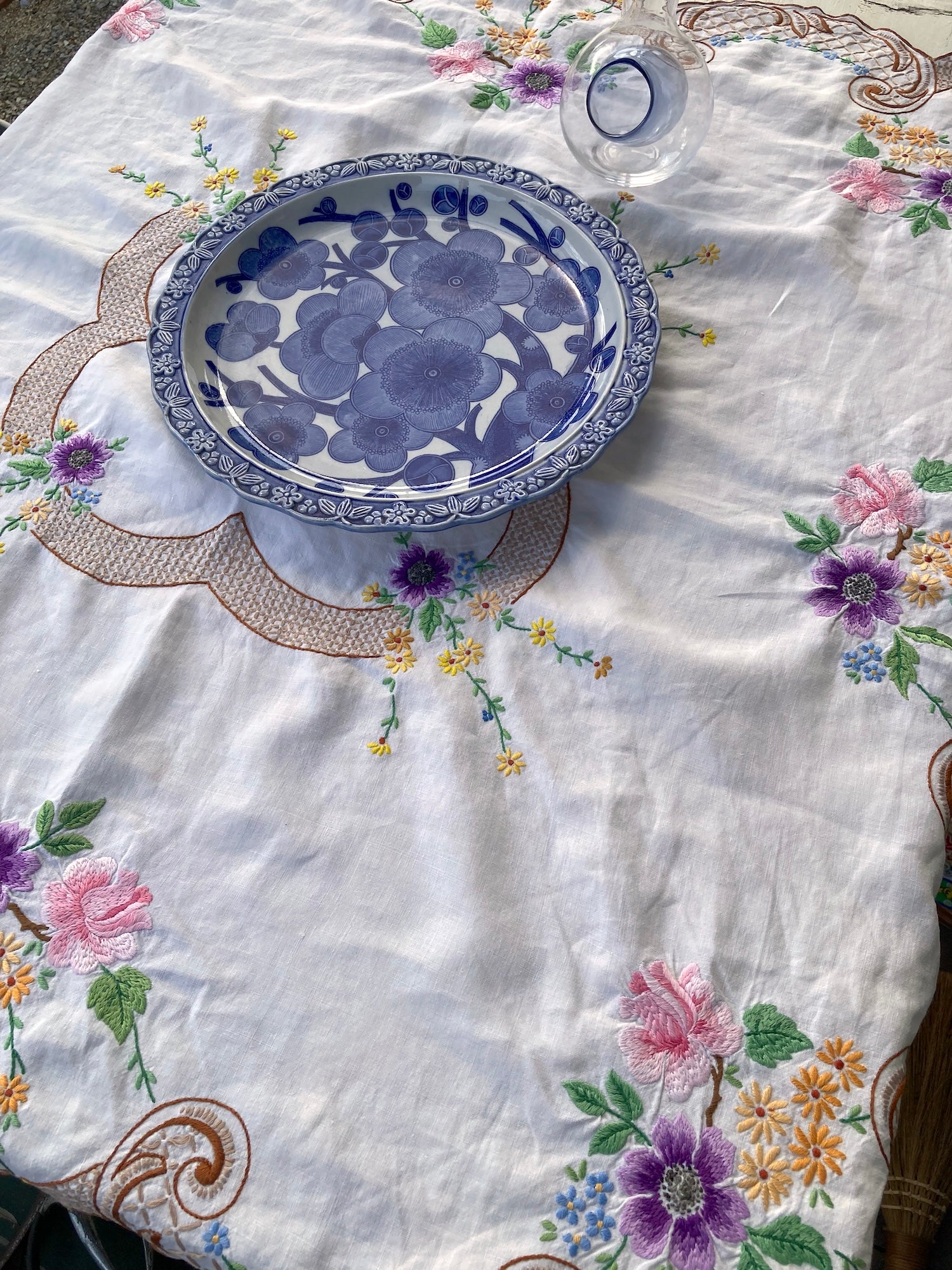 ヴィンテージ ハンドステッチ 刺繍 スカラップ テーブルクロス