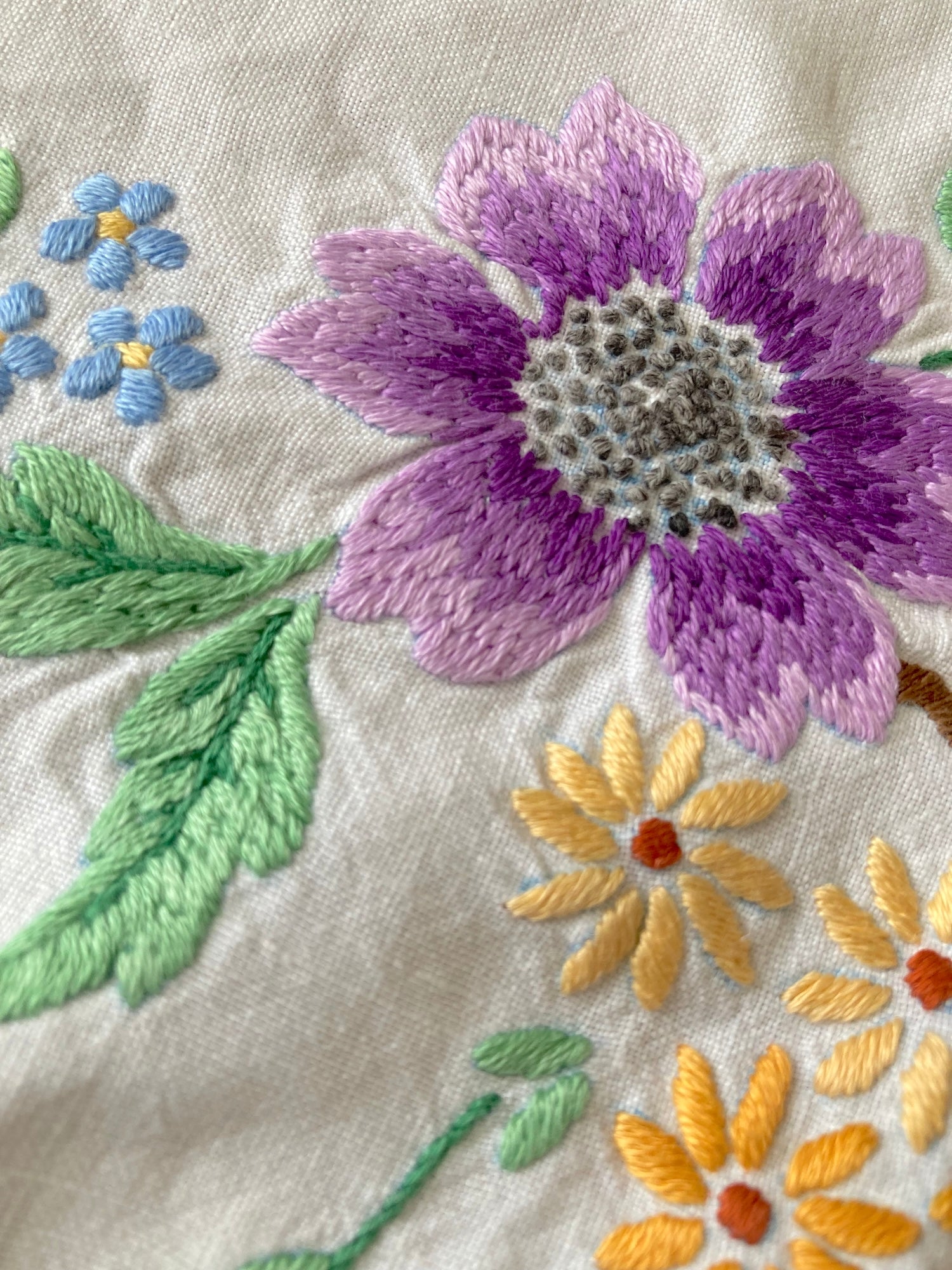 スカラップの縁取り以外、全面に施された美しい手刺繍が目を引くヴィンテージのマルチクロスです。鮮やかな色使いと丁寧な手仕事が織りなす刺繍ワークは、思わず見入ってしまうほどの魅力があります。